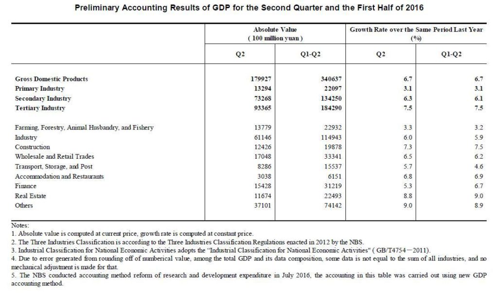* La méthode de calcul du PIB de la Chine a été modifiée. Le National Bureau of Statistics of China a décidé d’inclure dans sa formule les dépenses en recherche et développement, afin de « mieux refléter la contribution de l’innovation à la croissance économique et de promouvoir l’intégration de la comptabilité chinoise aux standards internationaux. » Cette intégration a peu d’effets en termes comparatifs. Sans prendre en compte ce changement, la croissance du PIB du premier semestre s’établit également à 6,7 %. En revanche, l’application de la nouvelle méthode conduit à un ajout de 218,4 milliards de yuan au PIB du premier trimestre 2016 (à 16 071 milliards de yuan).